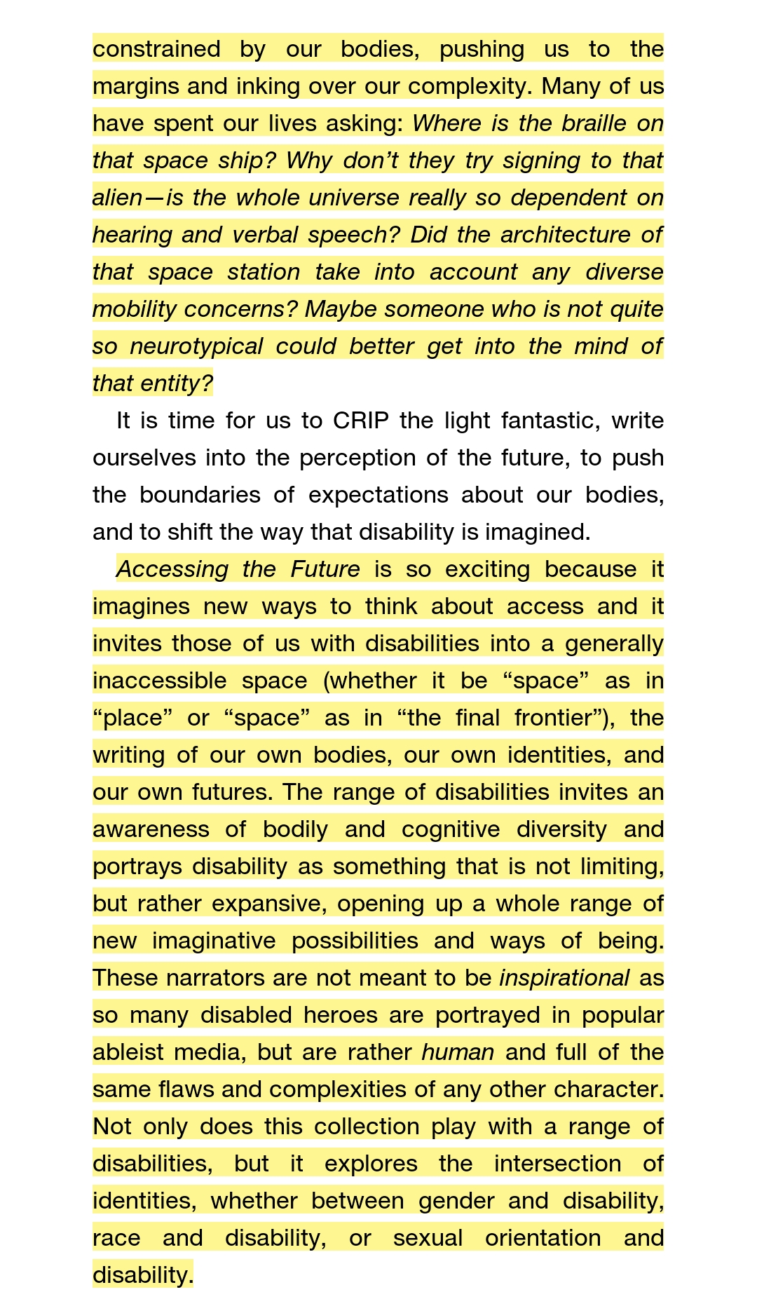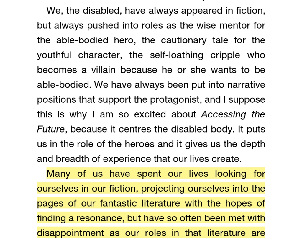 That said, the stories were a mix of really good, not-so-great, and meh. But that’s because I enjoyed some concepts, was completely confused by others, and found a few that really didn’t impress me. That’s a good thing! This anthology is disability-themed, it’s not about disability.