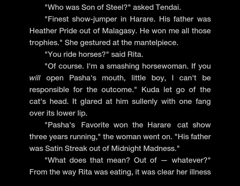 Do I sound really excited about this book? I’m afraid I’m not hugely so 😂 I don’t know why it’s set in Harare — except to give the children in the book names like Tendai and Kuda, and to talk about Borrowdale and Pomona. I was pretty annoyed with the setting, and also with Resthaven, an independent country (a Bantustan?? 😭) or village somewhere on the outskirts of Harare, where modernity is not allowed to intrude. (Incidentally, Resthaven had some of the best scenes!)
