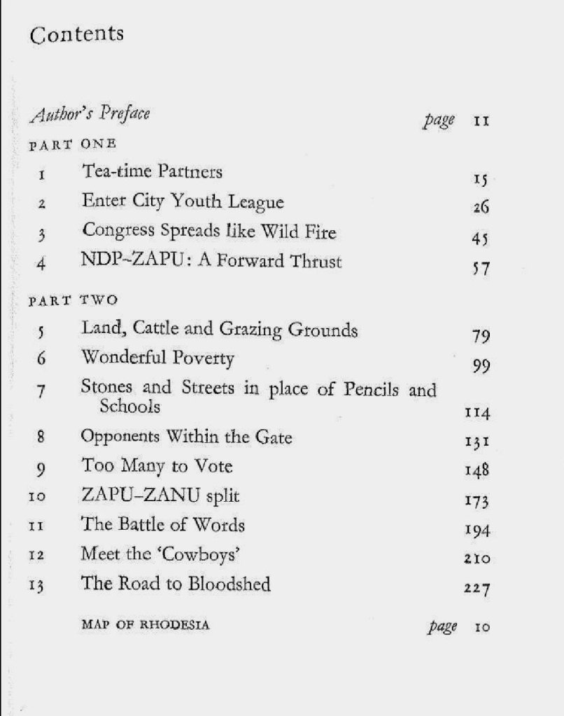 I had some idea of the events of this period, but this book fleshes out the highlights I knew with more complete detail about what Rhodesia was like, at the time, for black Zimbabweans; how the nationalists became politically aware; and how the nationalists began to mobilise the general populace, and to gain their support. It was also particularly useful to read Vesta Sithole’s version of events before I read this, because Crisis in Rhodesia gives detail from the other side about the reasons for the ZAPU split that led to the formation of ZANU, in 1963 (Ch. 10). It also offers some clarity about why ZANU later decided to go to war with the Rhodesians.