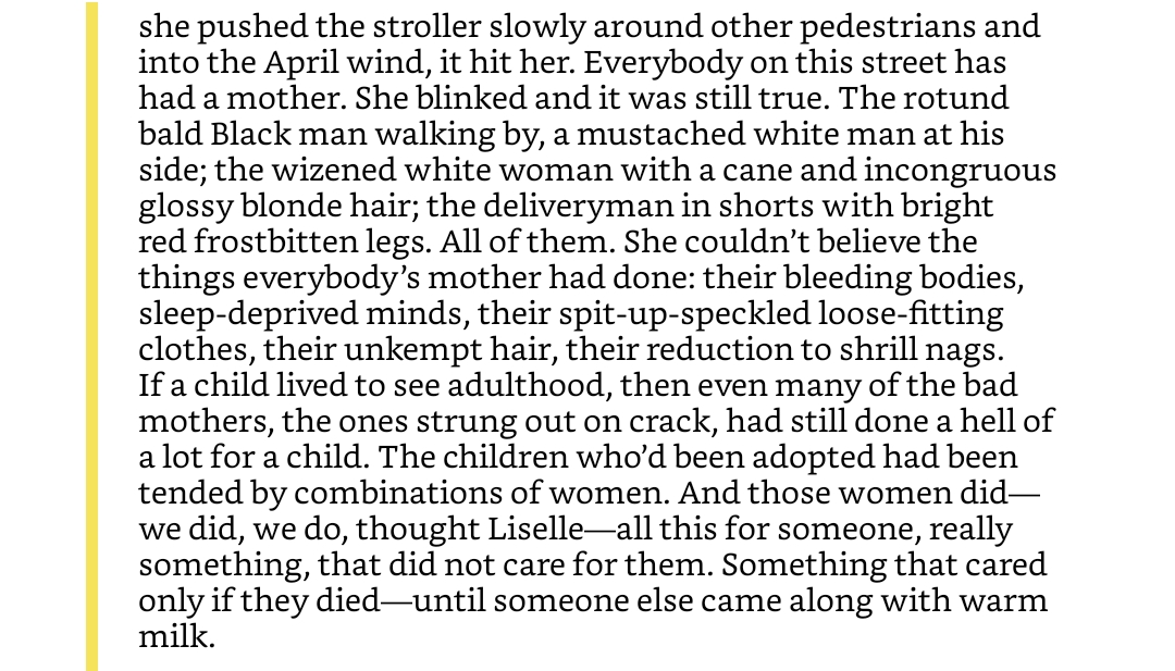 Ehh. I had looked forward to this book, so it disappointed me (pretty deeply). The premise was interesting <spoilers follow>: this is a story about a complicated lesbian relationship, in which one of the women is profoundly mentally ill (as becomes evident as the book progresses). (My tummy clenching at the thought of this poor, poor character.) The relationship seems to me to be quite toxic, and I’m not sure the author meant for it to be this way; so, we’ll settle for complicated.