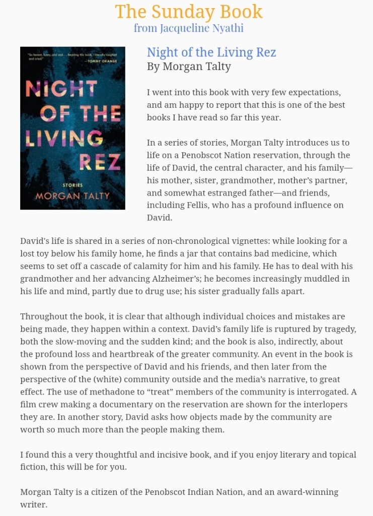 In a series of stories, Morgan Talty introduces us to life on a Penobscot Nation reservation, through the life of David, the central character, and his family—his mother, sister, grandmother, mother’s partner, and somewhat estranged father— and friends, including Fellis, who has a profound influence on David. David’s life is shared in a series of non-chronological vignettes: while looking for a lost toy below his family home, he finds a jar that contains bad medicine, which seems to set off a cascade of calamity for him and his family. He has to deal with his grandmother and her advancing Alzheimer’s; he becomes increasingly muddled in his life and mind, partly due to drug use; his sister gradually falls apart.