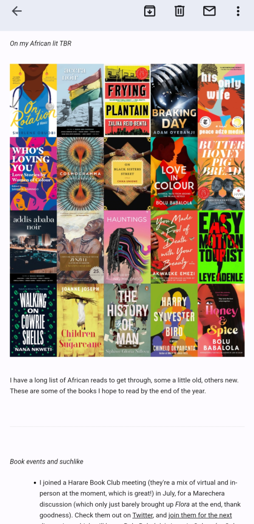 Have you checked out my books newsletter? I send it out once a month or thereabouts (depends on what life things are happening tbh, but I’ve been consistent this year). I talk about the books I’m reading, have read, or want to read, about events in the book world, book clubs, a few highlights from the blog, and things like that.