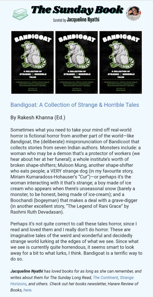Sometimes what you need to take your mind off real-world horror is fictional horror from another part of the world—like Bandigoat, the (deliberate) mispronunciation of Bandicoot that collects stories from seven Indian authors. Monsters include: a woman who may be a demon that’s a protector of workers (we hear about her at her funeral); a whole institute’s worth of broken shape-shifters; Muloon Mung, another shape-shifter who eats people; a VERY strange dog (in my favourite story, Miriam Kumaradoss-Hohauser’s “Cur”)—or perhaps it’s the woman interacting with it that’s strange; a boy made of ice cream who appears when there’s unseasonal snow (barely a monster, to be honest, being made of ice-cream); and a Boochandi (bogeyman) that makes a deal with a grave-digger (in another excellent story, “The Legend of Rani Grace” by Rashmi Ruth Devadasan).