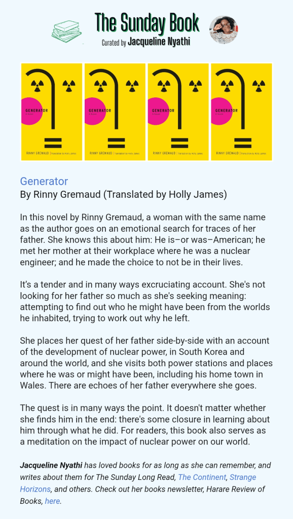 The quest is in many ways the point. It doesn’t matter whether she finds him in the end: there’s some closure in learning about him through what he did. For readers, this book also serves as a meditation on the impact of nuclear power on our world.