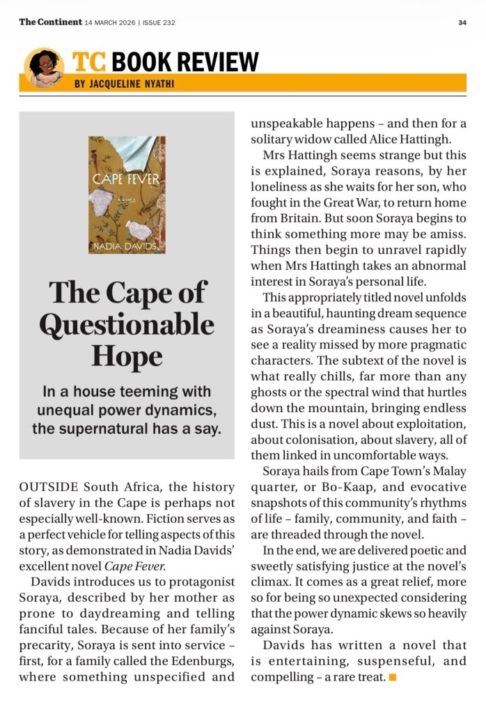 If Mrs Hattingh proves to be a sympathetic figure—just barely—in the end, Davids also delivers a poetic and so sweetly satisfying justice, something readers cannot always expect with stories like this. It’s a great relief, unexpected when the power dynamic skews so heavily against Soraya, and so strongly in favour of her employer. Davids has written a novel that is entertaining, suspenseful, and compelling, a very rare treat.